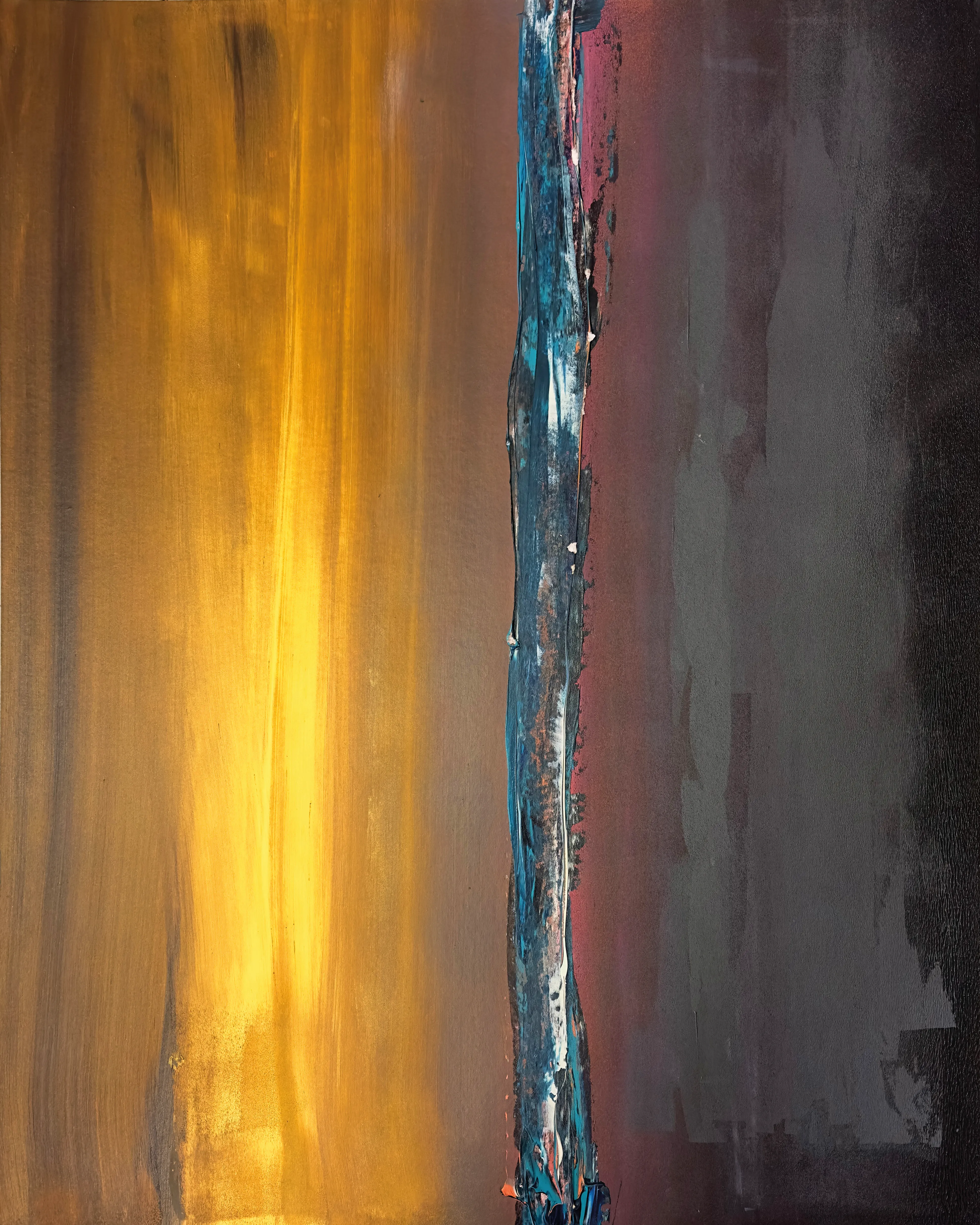 THIS EXHIBITION PRESENTS WORKS THAT PAY TRIBUTE TO THE FASCINATING DYNAMIC THAT EMERGES WHEN TWO WORLDS ARE SEPARATED. ON ONE SIDE, A COLOR FIELD STANDS RADIANT YET ENIGMATIC; ON THE OTHER, ANOTHER SURFACE RESPONDS WITH EQUAL INTENSITY. BUT IT IS THE STRIPE — THE MOVEMENT IN BETWEEN — THAT BREAKS OPEN AND REVEALS THE ESSENCE.